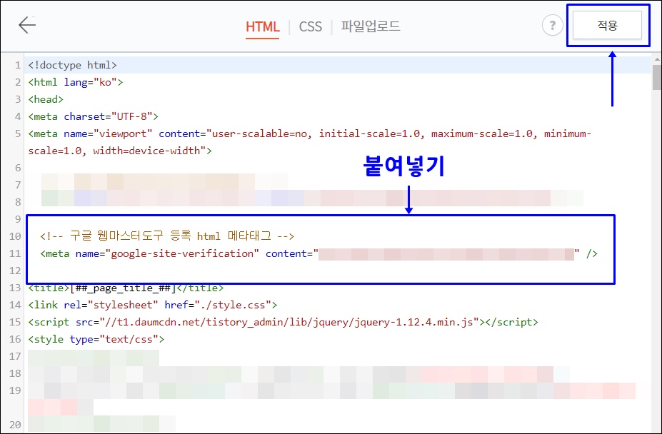 <!-- 구글 웹사이트 등록 메타태그 --> 를 입력합니다. 그리고 오른쪽 상단에 '적용' 버튼을 클릭해서 저장한 후 구글 서치콘솔 도구 화면으로 돌아옵니다.