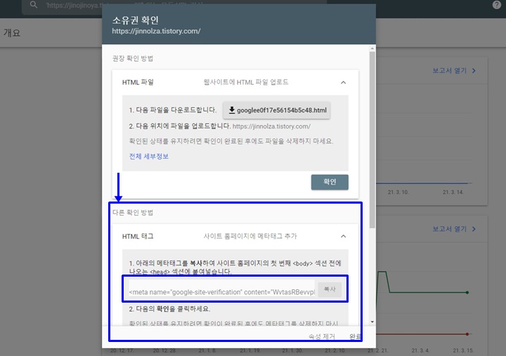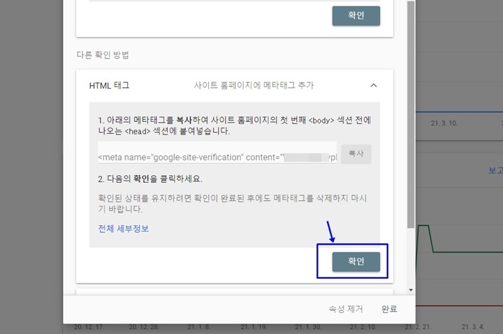 <meta name = "google-site-verification" content = "XXXXXX"...> 옆에 '복사' 버튼을 클릭하여 메타태그 정보를 복사합니다.