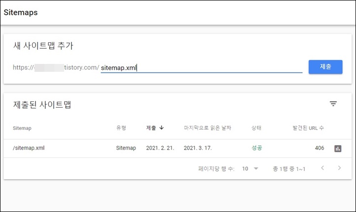 aaa.tistory.com/ 끝에 sitemap.xml 을 입력하여 aaa.tistory.com/sitemap.xml 이 되도록 합니다. 그리고 엔터를 치면 rss와 마찬가지로 sitemap.xml 이 성공적으로 제출이 되었습니다.