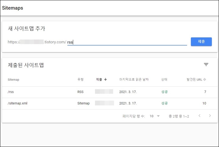 여기까지 구글 서치콘솔에 티스토리나 웹사이트 주소를 등록하고 구글의 메타태그를 티스토리에 저장하면서 구글이 티스토리 검색할 수 있는 권한이 주어진 것입니다. 하지만 이게 끝이 아닙니다. 구글에 RSS 등록과 Sitemap.xml 도 등록시켜줘야 합니다.