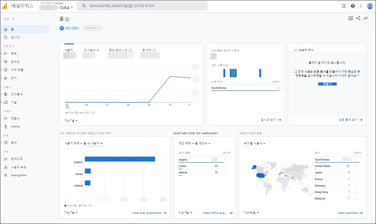 5. 구글애널리틱스 창이 뜨면서 해당 계정의 속성창이 나타납니다.